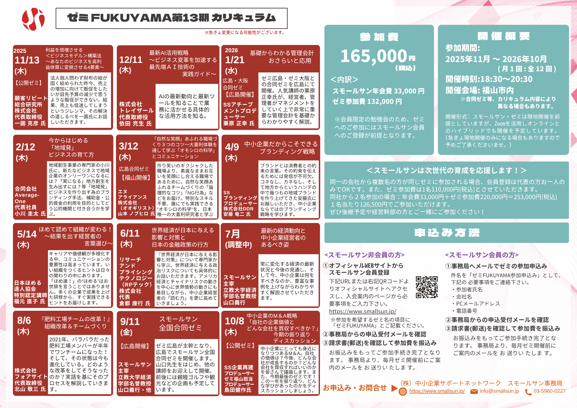 2025年11月13日(木)より、スモールサン会員限定の経営者勉強会【ゼミFUKUYAMA】第13期がスタートします!