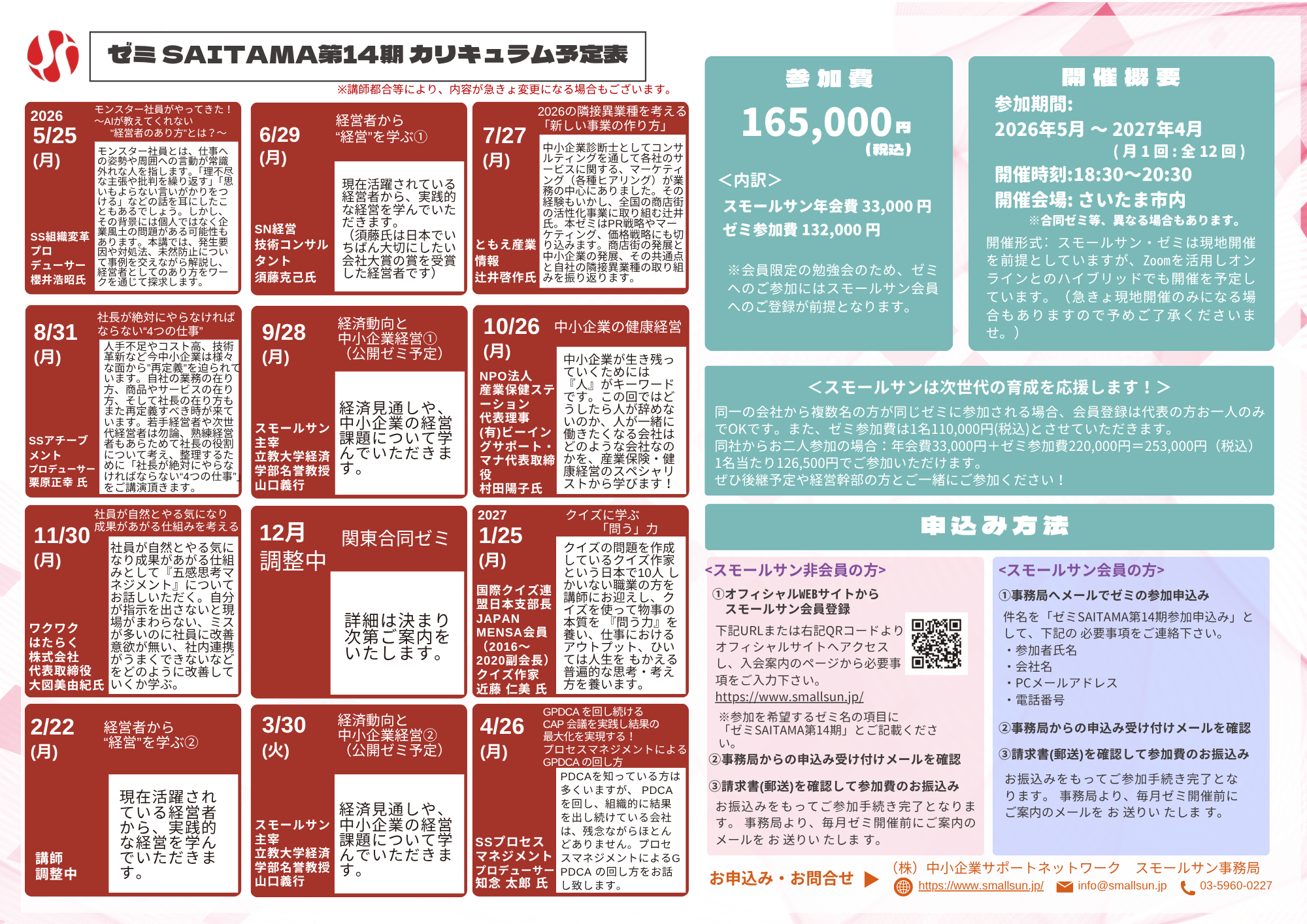 2026年5月25日(月)より、スモールサン会員限定の経営者勉強会【ゼミSAITAMA】第14期がスタートします!
