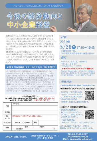 講演ではそうした情勢把握とともに、政府がとるべき緊急施策、中小企業経営者が行うべき経営実践などについてお話しします。スモールサンが提唱してきた経営者の「読む力」「問う力」「つなぐ力」を今こそ発揮して、皆さん、この苦境をともに乗り越えていきましょう。
